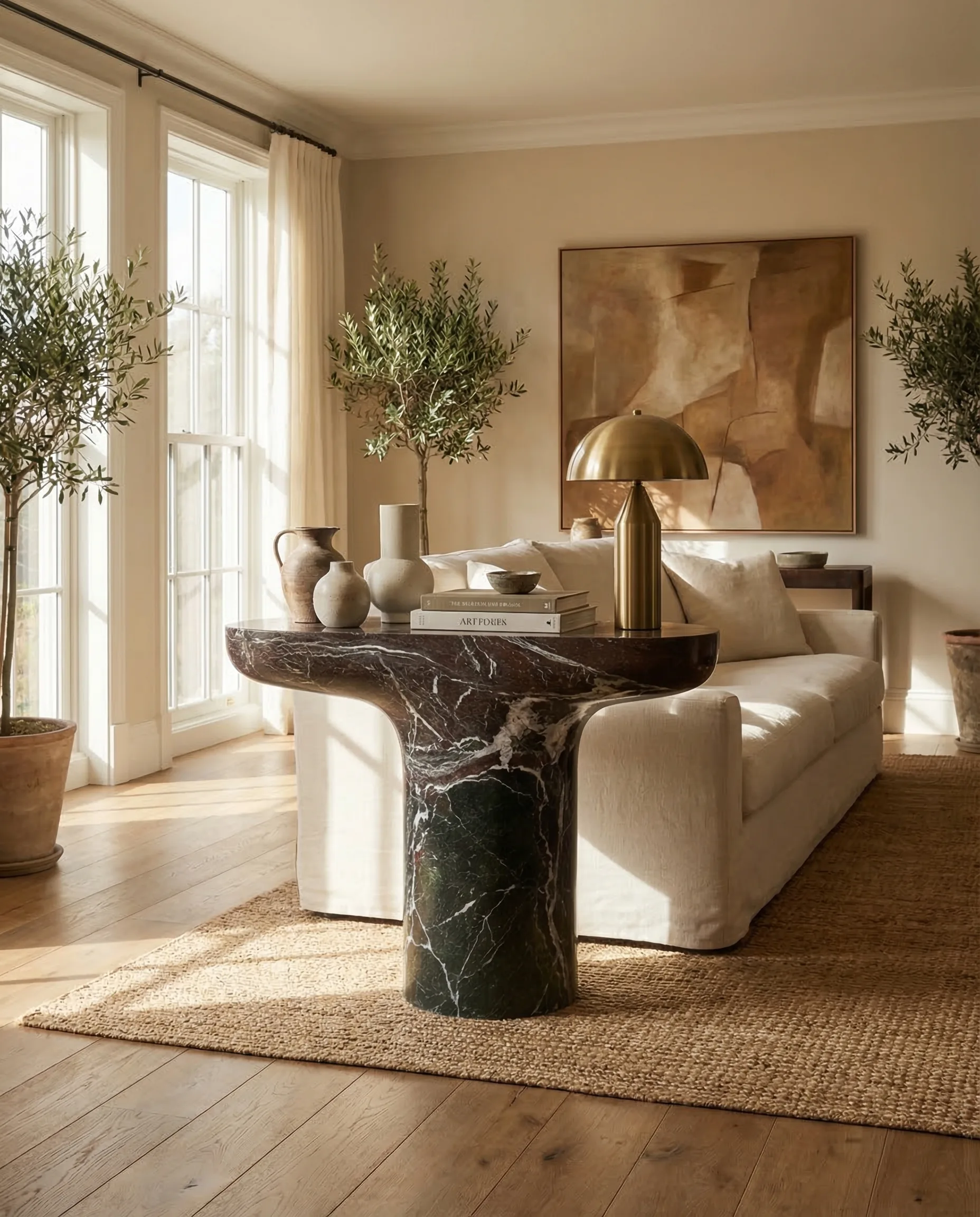 Morphe — from the Greek for form — is a console that appears to shift depending on position and light. The stone takes on different qualities as the day moves through a room; the silhouette reads differently from every angle.