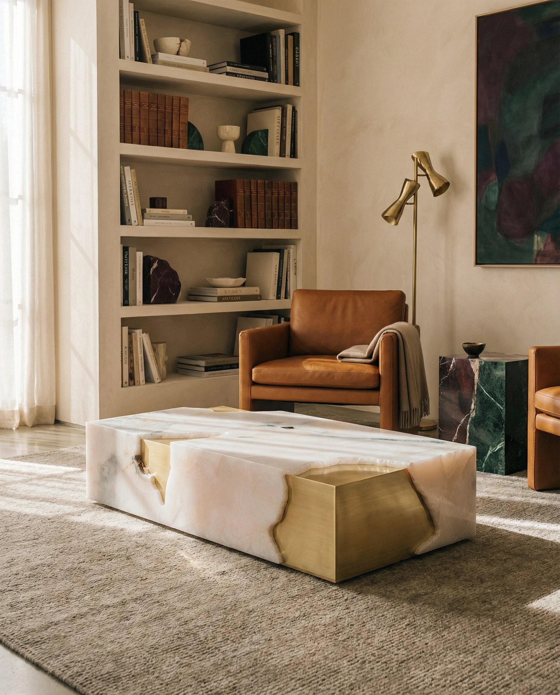 Shown here in White Onyx. Arthur is offered in four stone selections, available with a polished or honed finish. Because the piece is carved from a single block, the stone is hand-selected for continuous veining — the pattern must work across the full height, not merely the top surface.