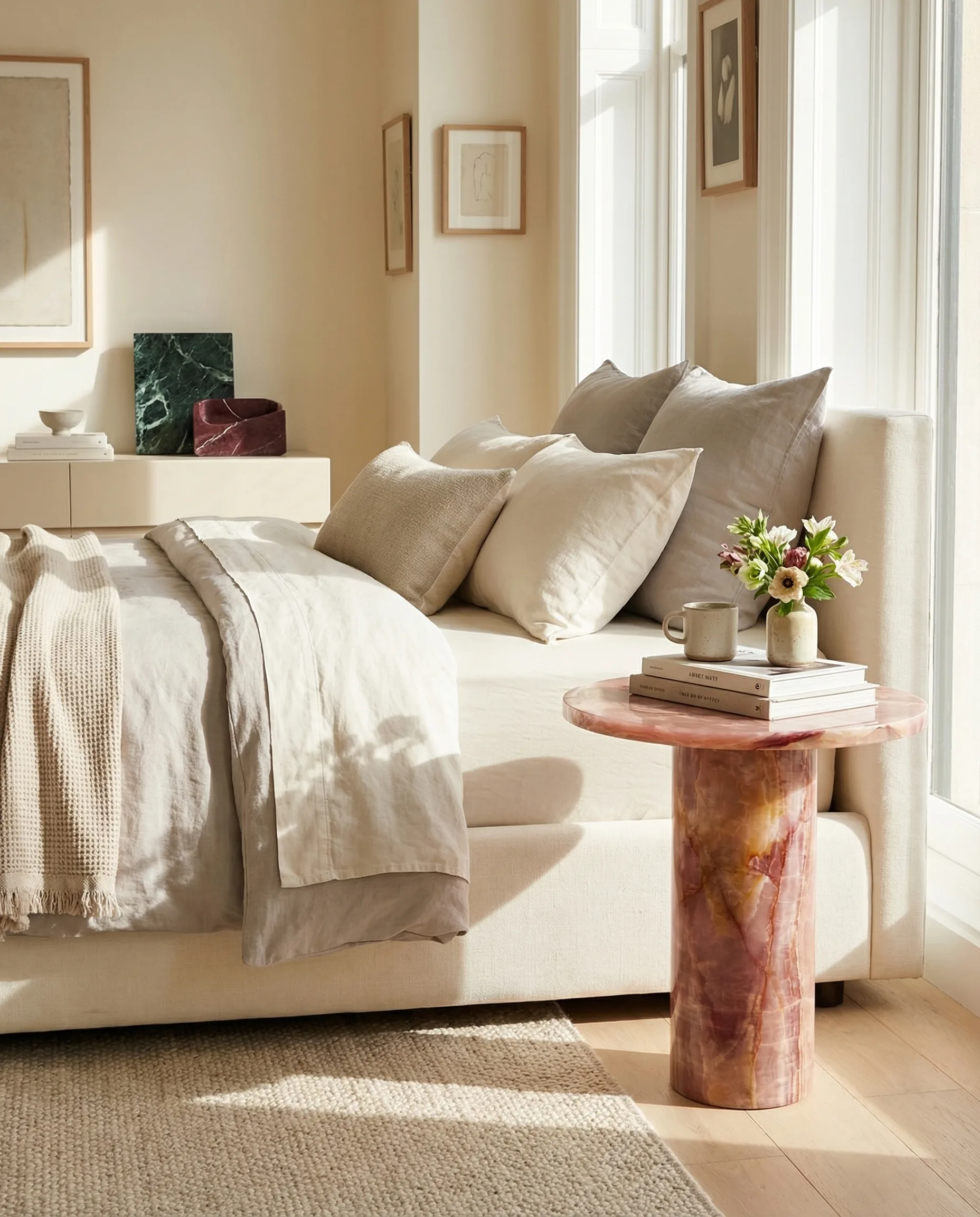 A single cylinder rises to meet a generous round top — pink onyx at its most elemental. Rosa distils the side table to its purest geometry: circle upon circle, warm stone catching the light from every angle.