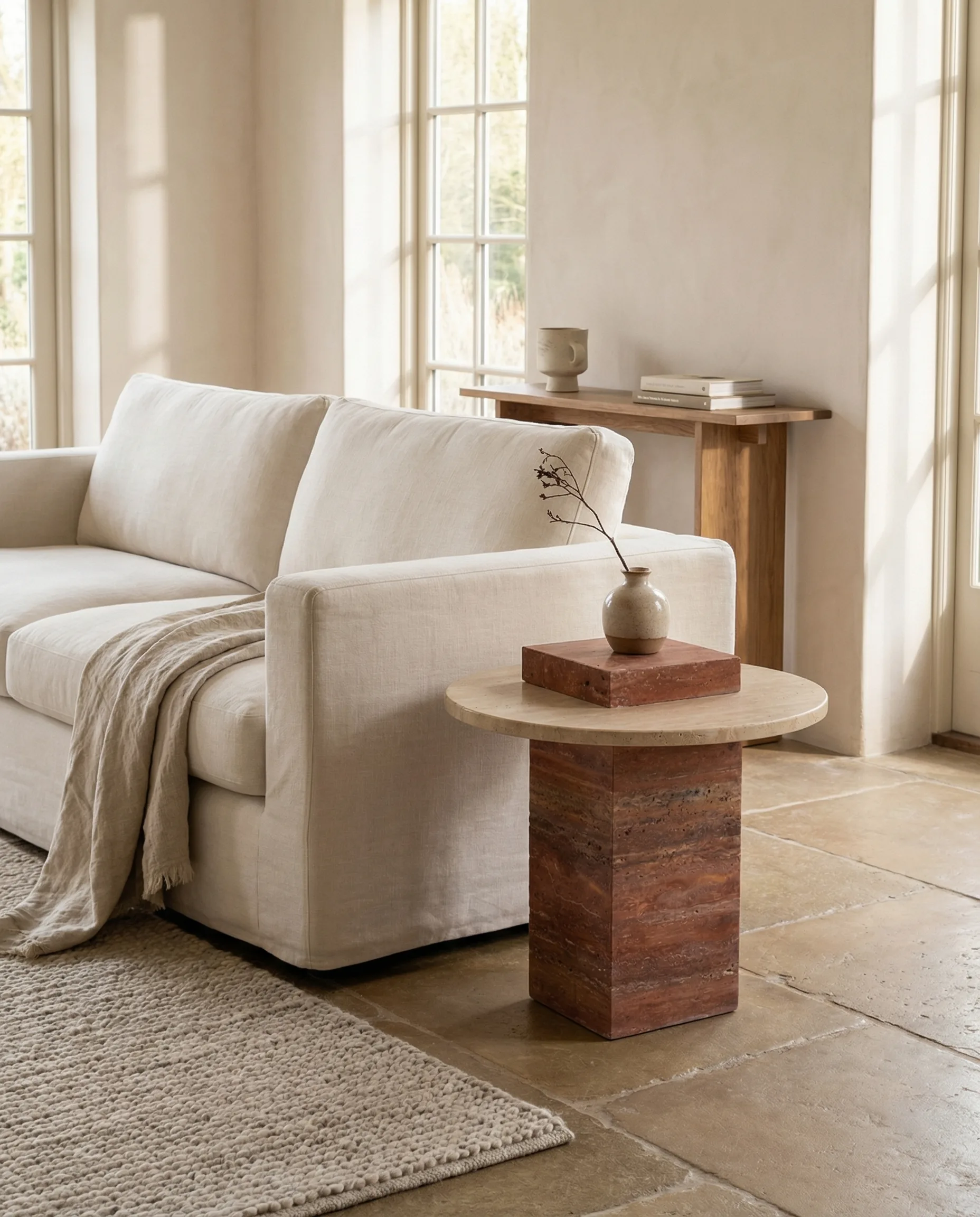 Altare operates at the scale of the hand and the body. A side table is the most private of furniture — it holds what is held dear. The stone chosen, the form resolved, the weight felt when you rest your hand on it: intimacy built from material certainty.