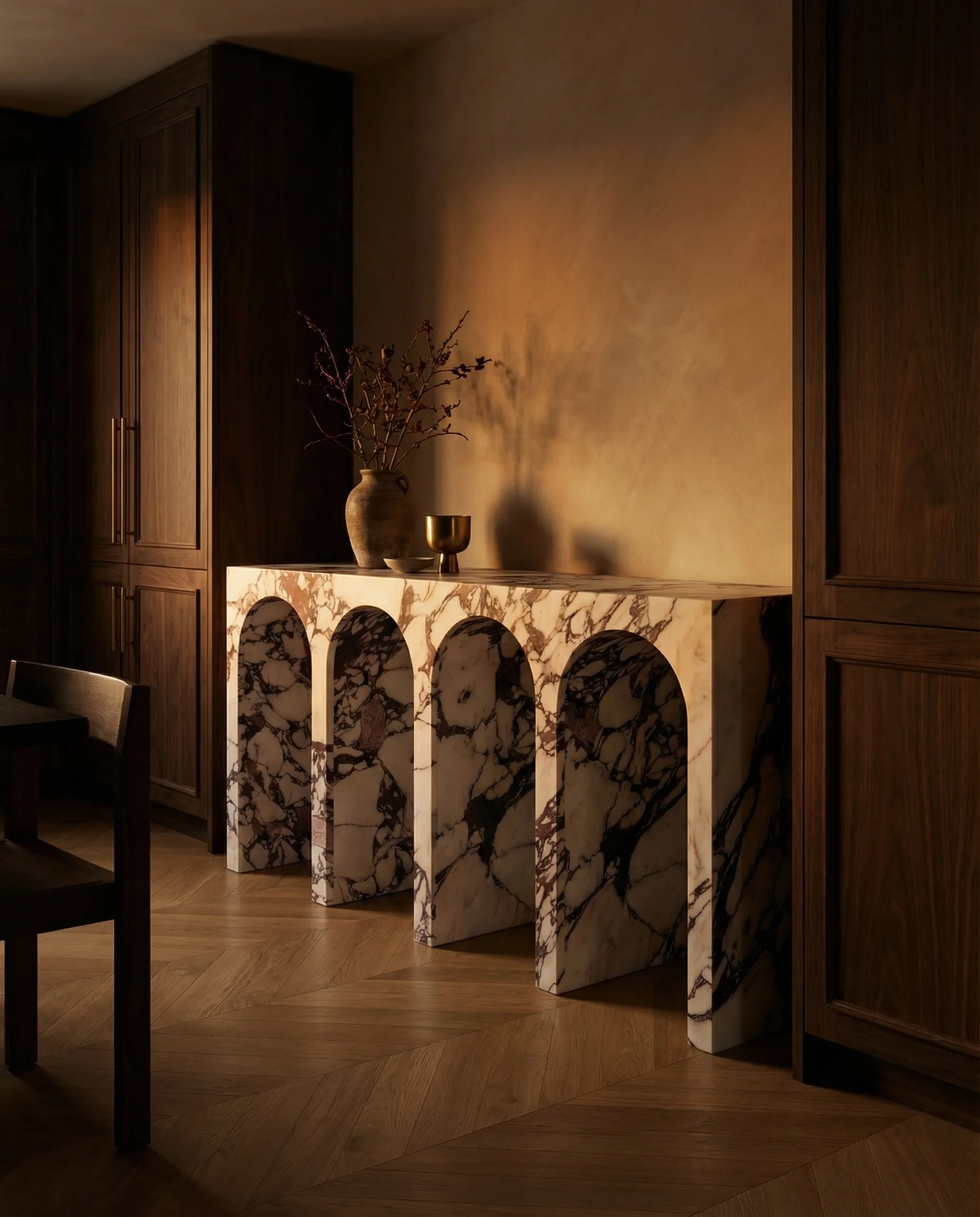 Five arched voids define the base of this Calacatta Viola console — a colonnade in miniature. The arcade form has held up buildings for two thousand years; here it holds a surface.