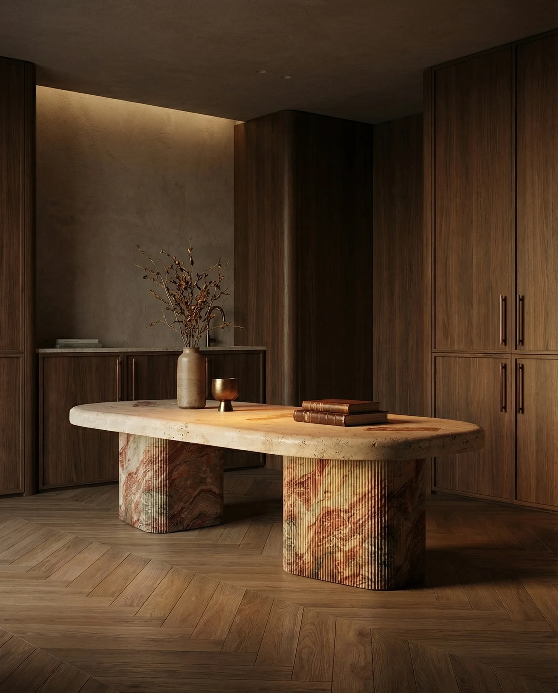 Two contrasting travertines — cream and deep red — meet in a single oval surface above ribbed marble legs. The crossroads of colour and form made permanent in stone.