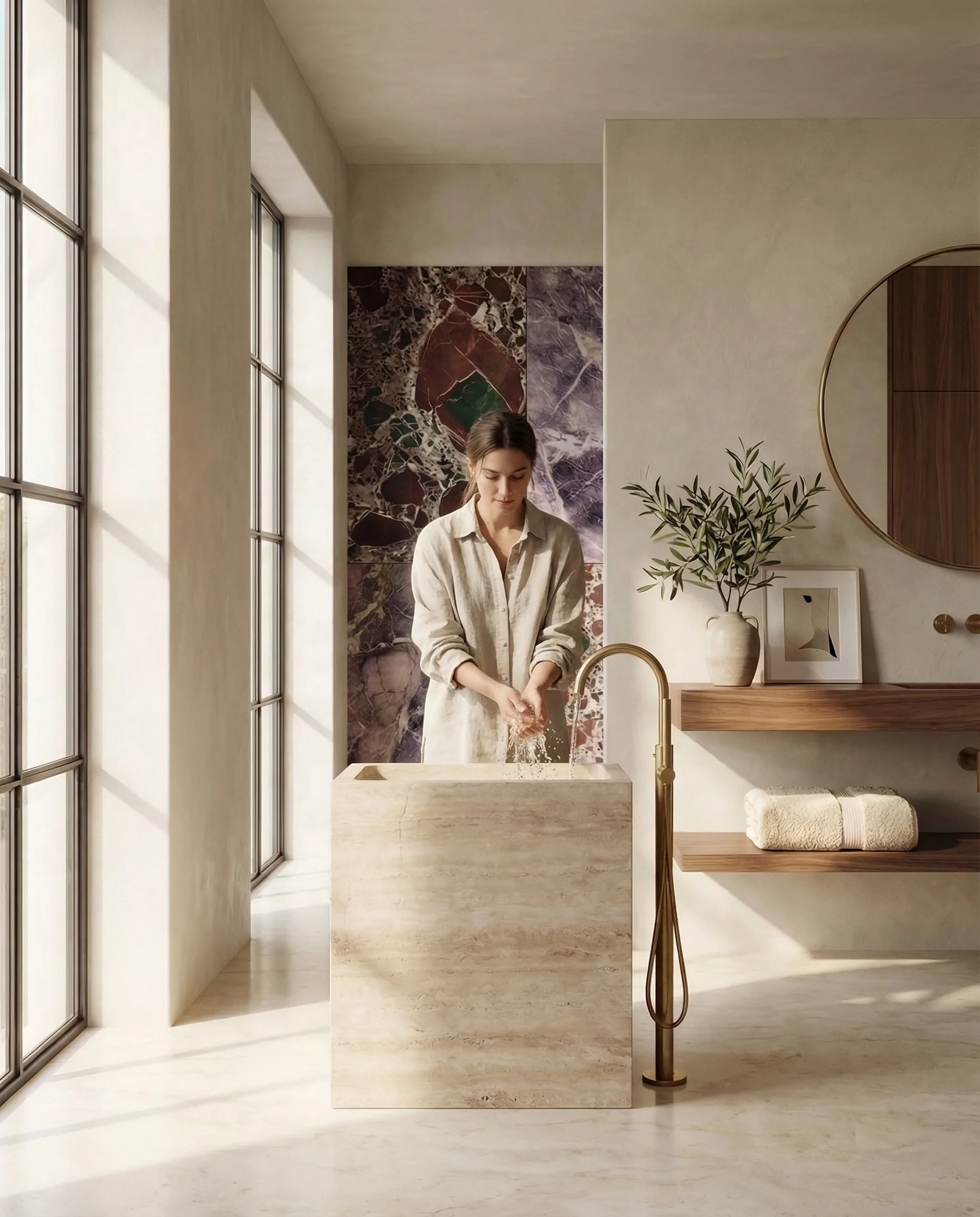 A monolithic travertine block with a precisely carved basin — raw geometry that defines the space around it. Blocco is architecture at the scale of a washbasin.