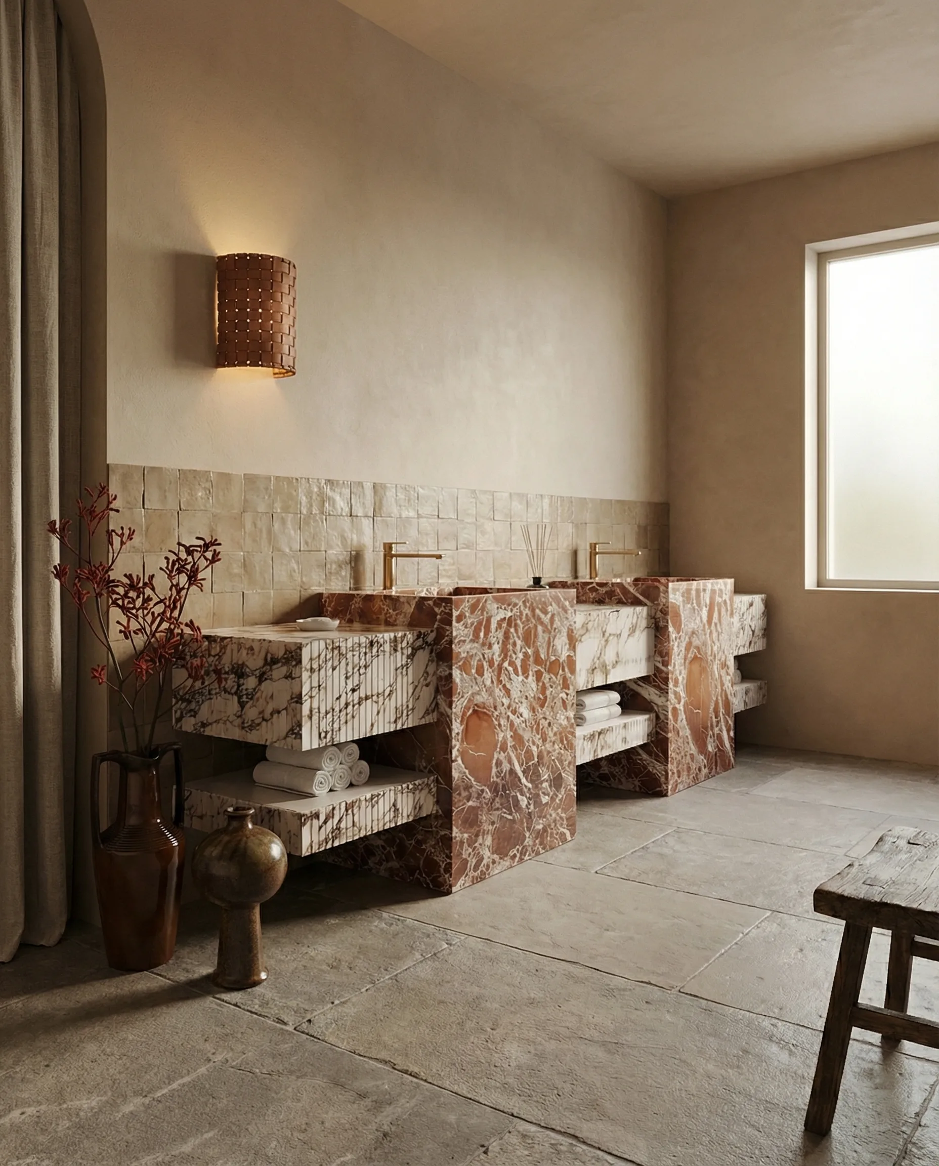 The washbasin is encountered more often than any other piece of stone in a home. Coppia is designed to reward that frequency — to reveal new aspects of the material as the light moves across it through the day.