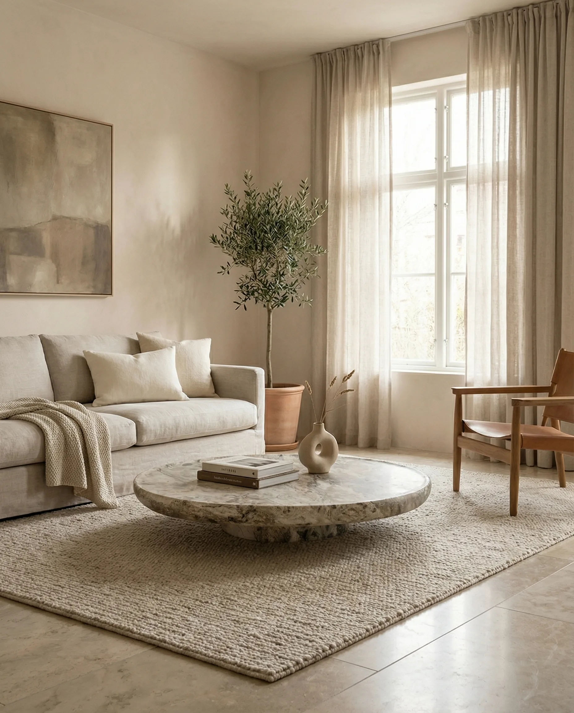 A generous circular disc in mixed travertine rests on a single low pedestal. The table as pure surface — no unnecessary structure, no distraction from the stone's horizontal expanse.