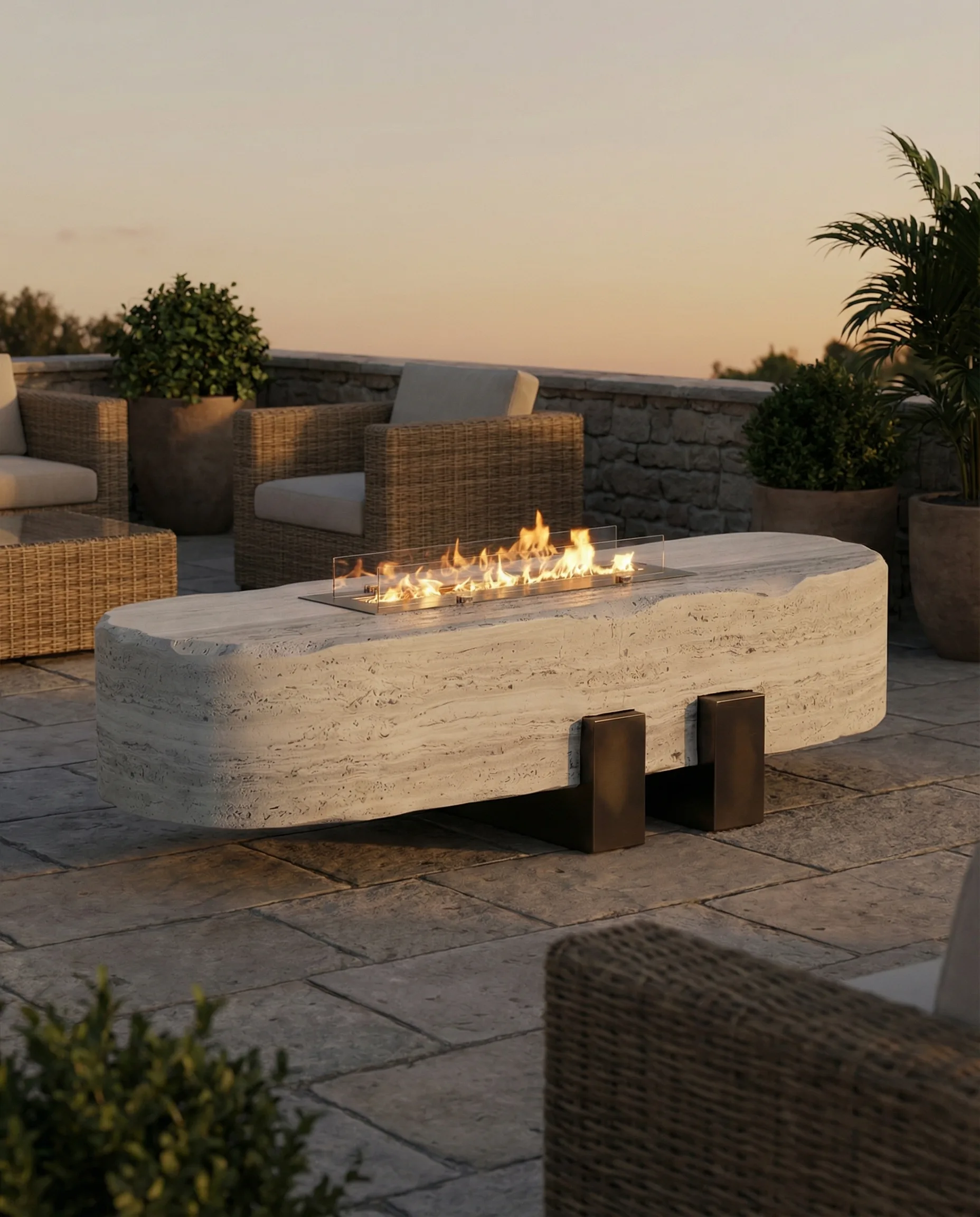 Travertine curved into an elliptical vessel, a linear flame running through its heart, carried on bronze stands. Fire and stone: the oldest pairing, made furniture at last.