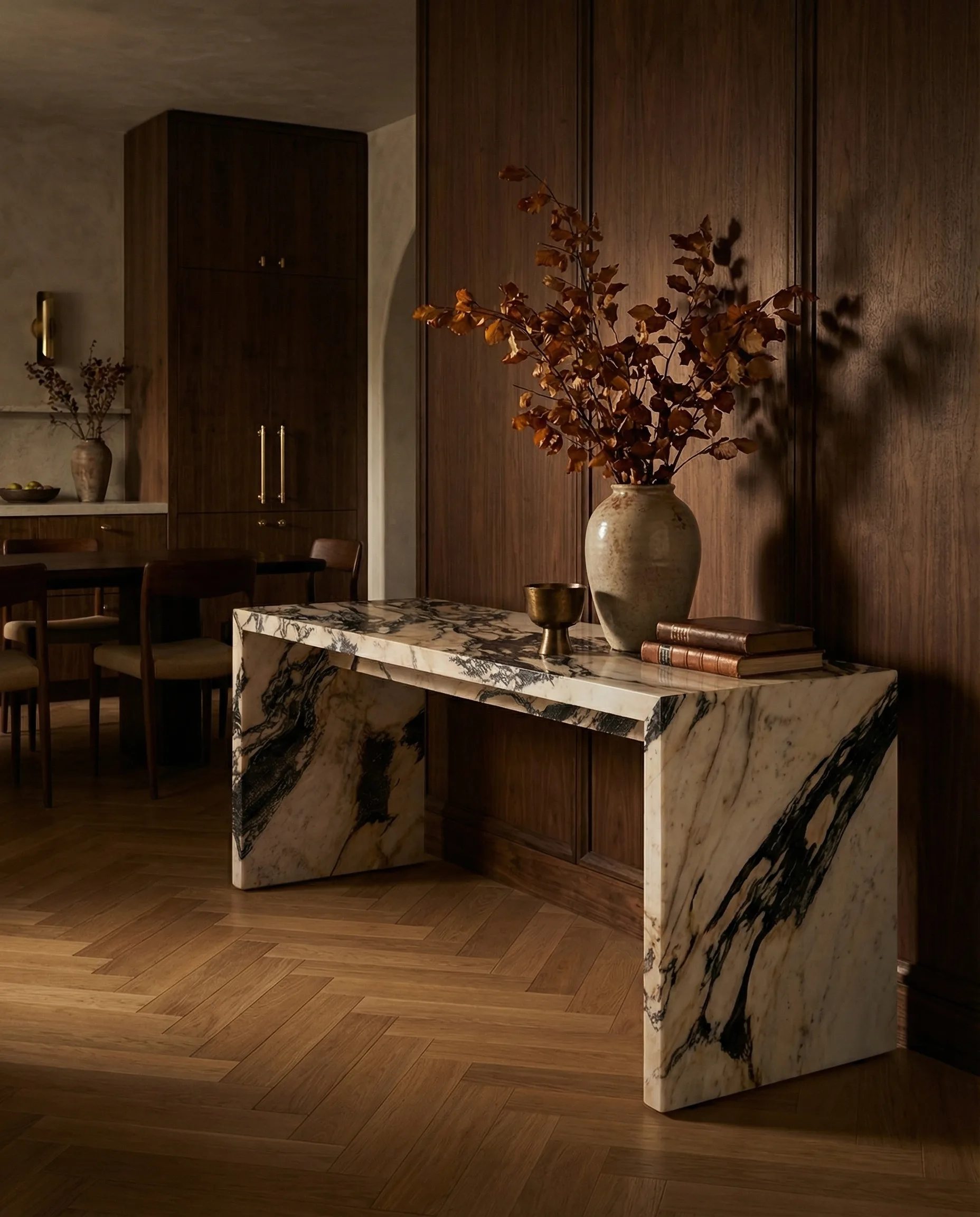 A waterfall bench of Calacatta black — the marble folds in one uninterrupted pour from seat to floor. The gesture is simple; the material execution, extraordinary.