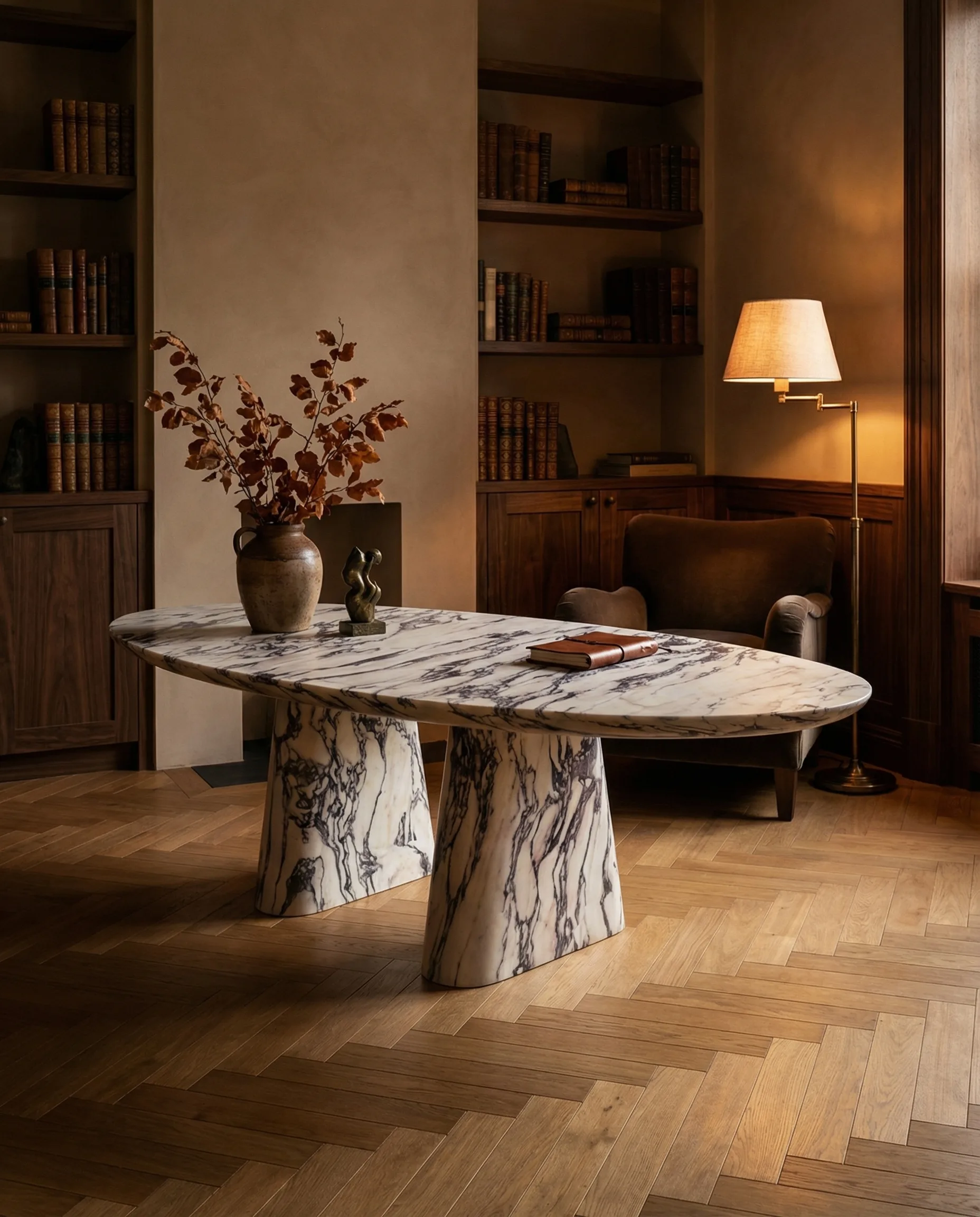 A sweeping oval of Calacatta Viola balanced on two conical columns — Juno presiding over the feast. The drama of the stone matched by the authority of the form.