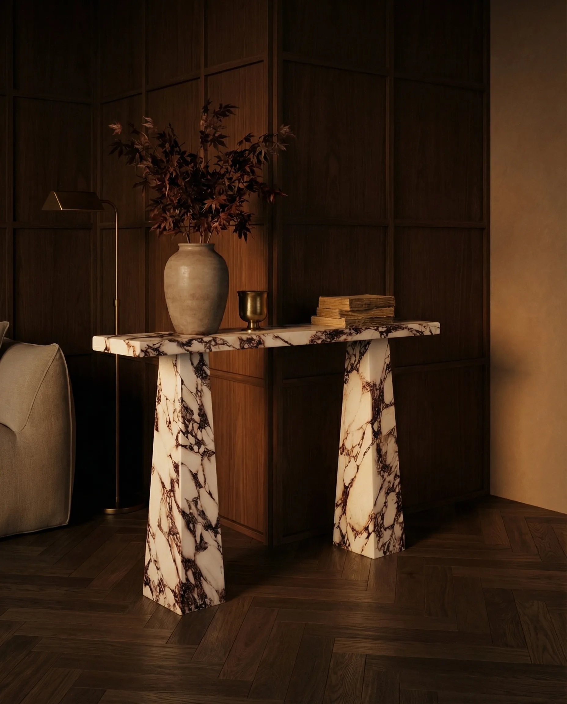 A long blade of Calacatta Viola balanced on two trapezoidal legs — each vein a brushstroke drawn the length of the surface. Elongated beyond expectation, resolved with complete confidence.