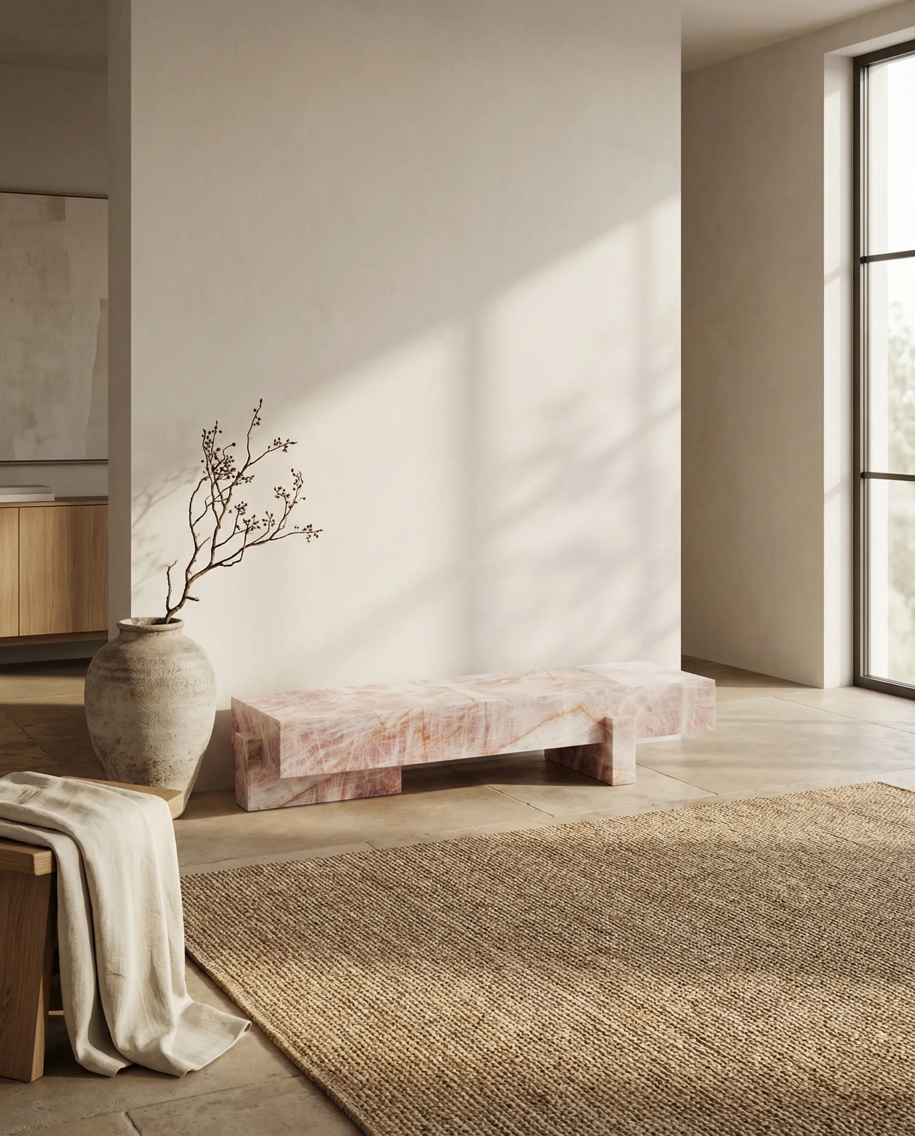 A slab of rose quartz resting on minimal geometric feet — the stone commanding space without apology. The surface is the piece; everything else is in service of it.