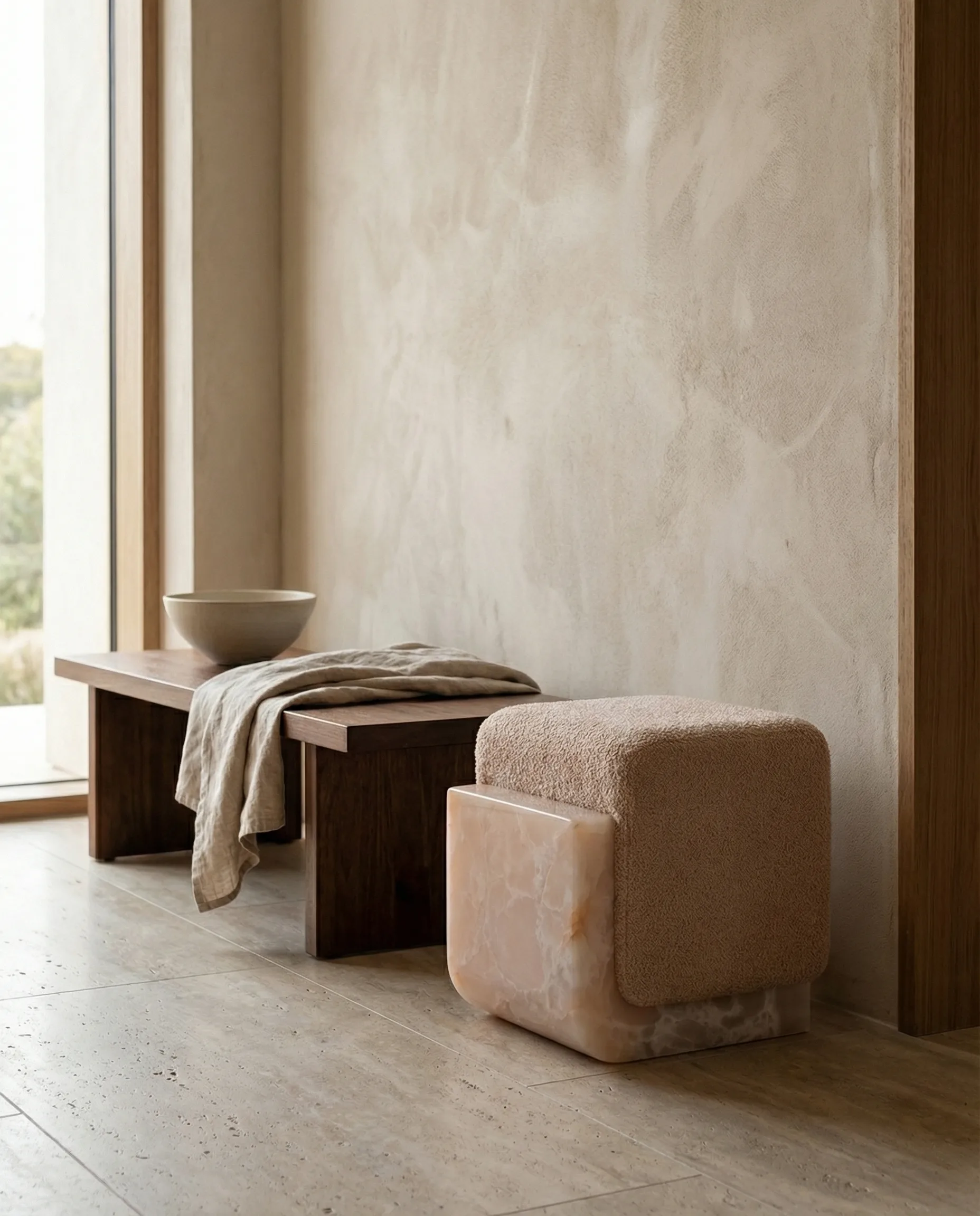 A deep pink marble cradle embraces a bouclé cushion — the nest made permanent in stone. The marble does the holding; the textile does the receiving. Neither could exist without the other.
