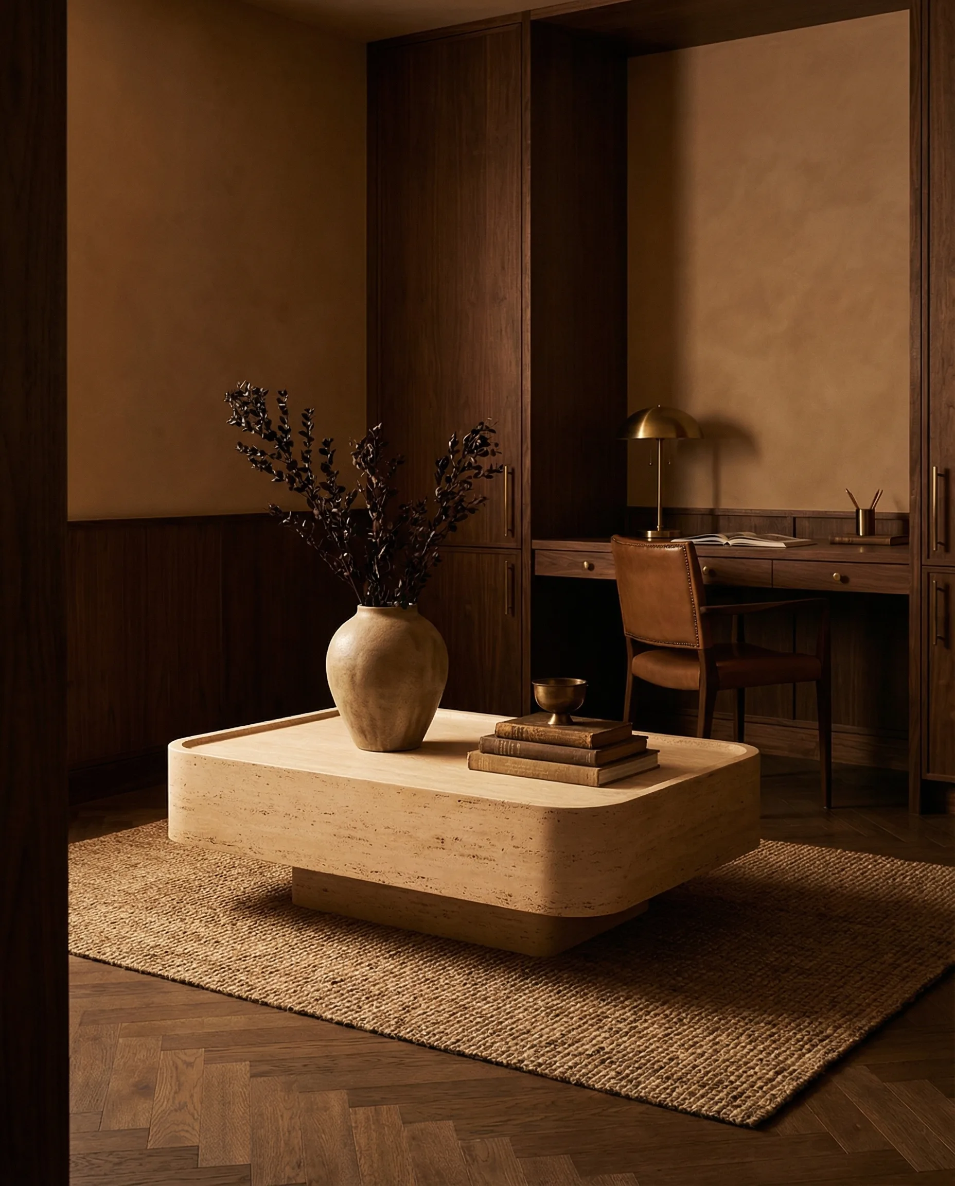 Petto holds a room together. The coffee table is the one piece of furniture that every seat faces — it becomes the ground beneath conversation, beneath objects, beneath light. In stone, it holds that gravity permanently and without effort.
