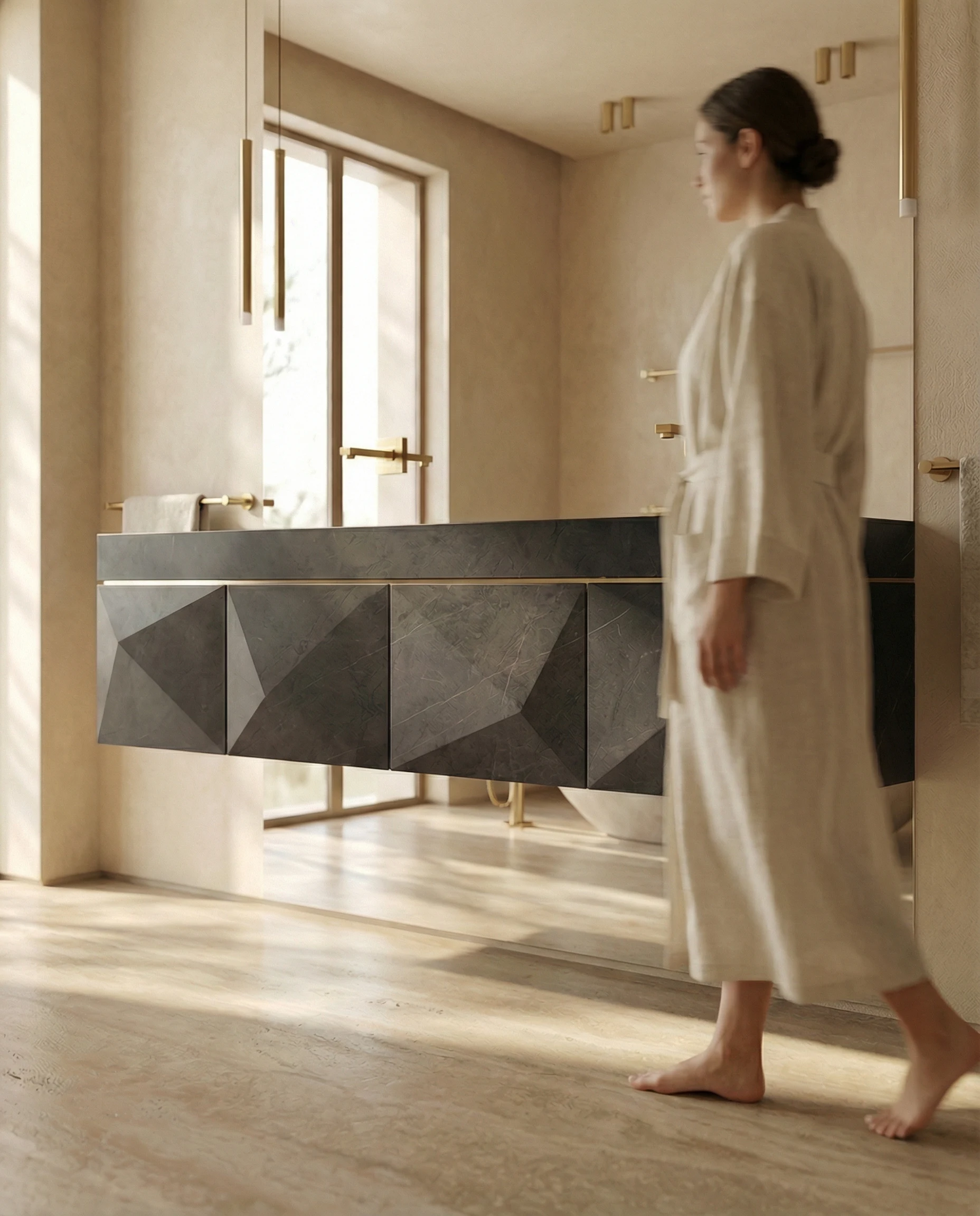 Shown here in Basalt. The Punta Due is offered in a curated selection of natural stones, each fluted to the same geometry. The frame is available in blackened steel as standard; brushed gunmetal and aged bronze are offered on request. Stone is hand-selected for veining orientation — the drama depends entirely on how the light moves across it.