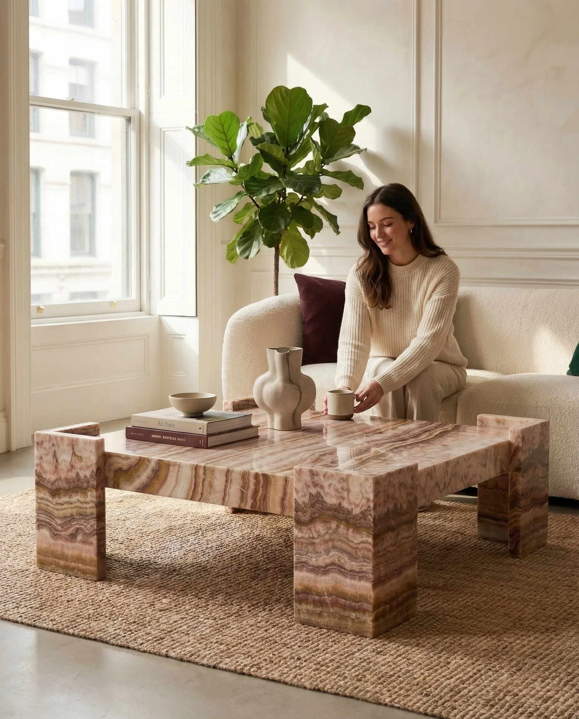 The warmth of pink onyx transforms Quadro from a geometric exercise into something alive. Light passes through the thinner edges, revealing translucent strata and honey-toned veins that shift with the hour and the season.