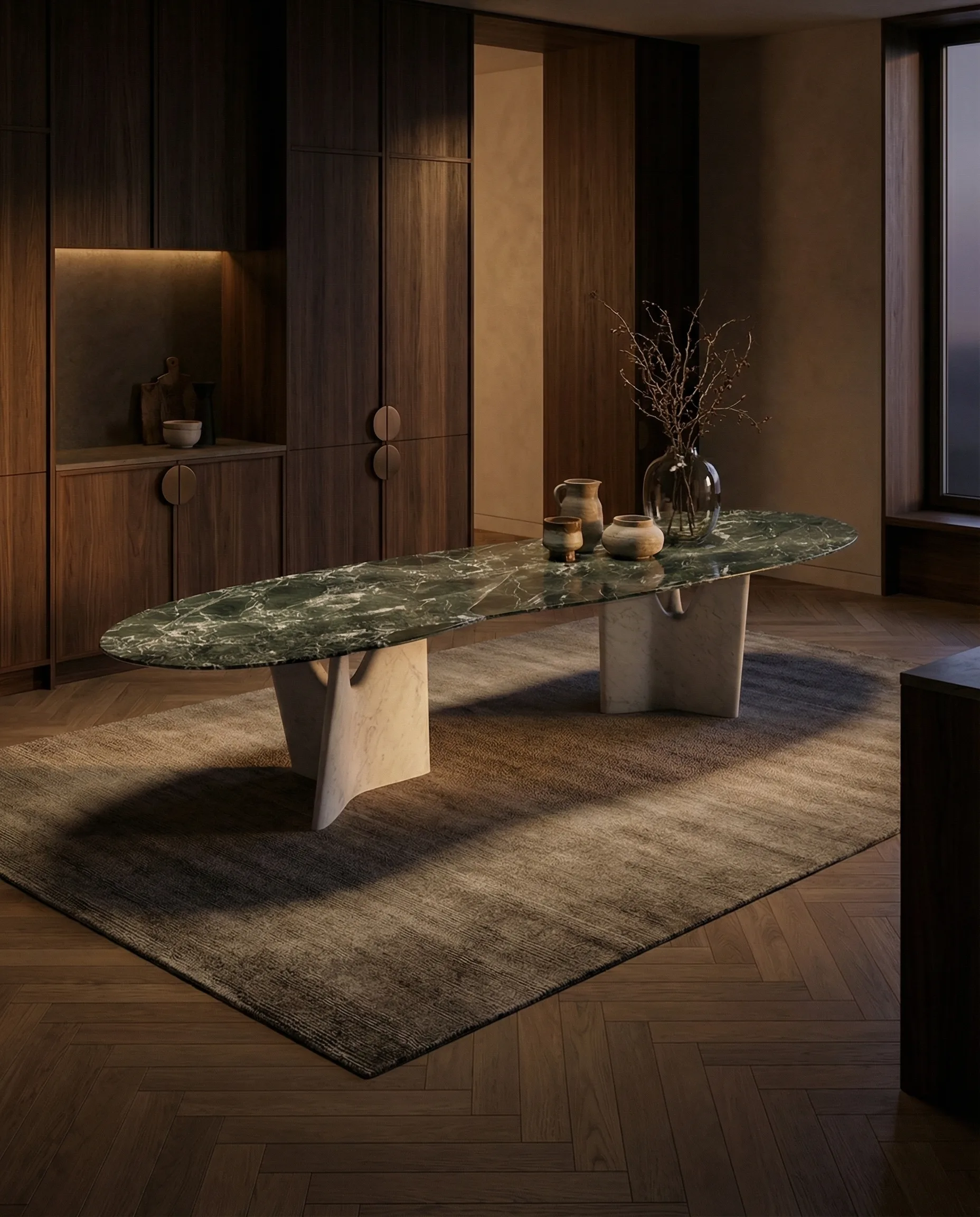 An asymmetric, flowing top in dark green marble carried by paired white arch-cut legs. The organic form above and the architectural form below — two languages, one resolved piece.