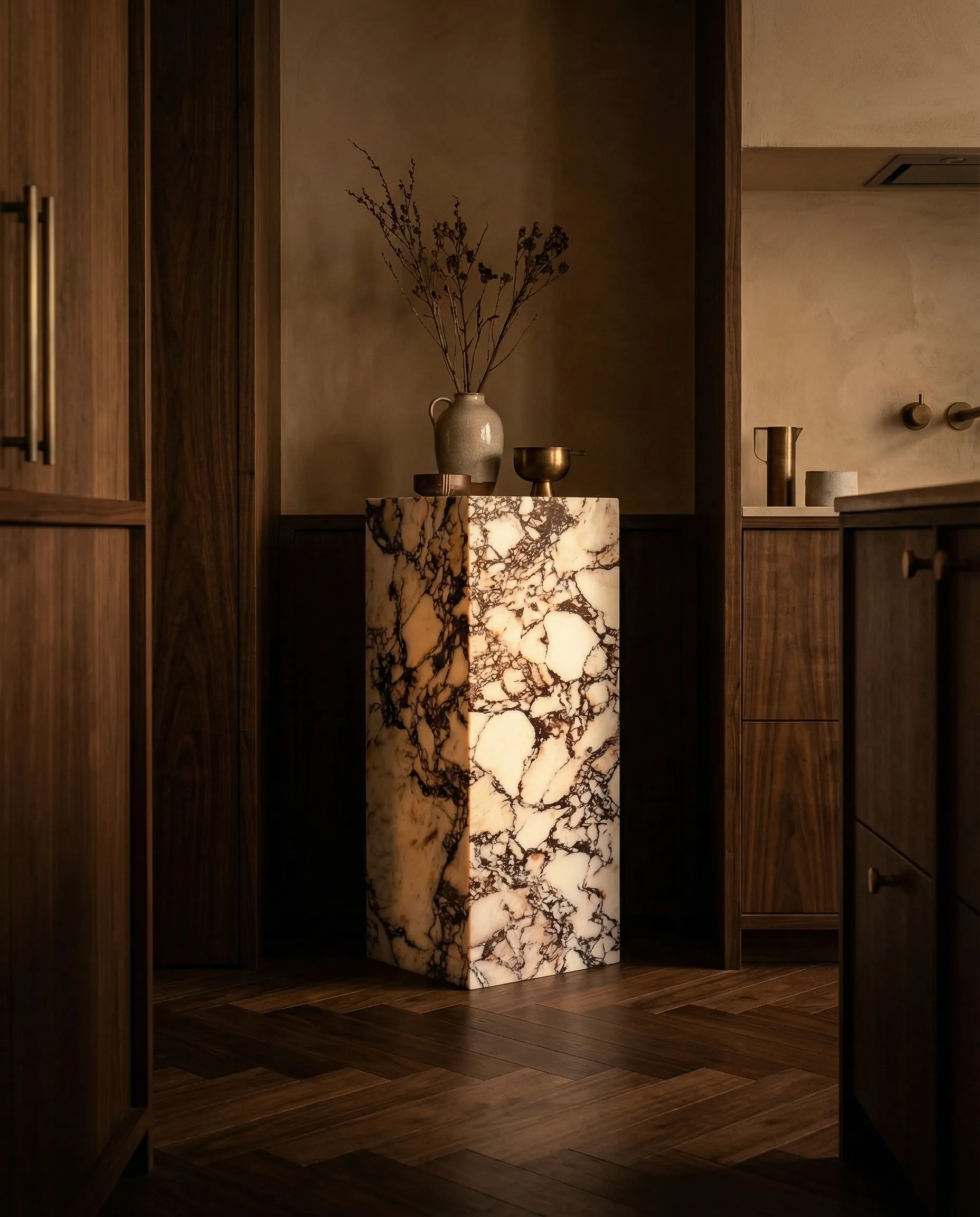 A tall, upright panel of Calacatta Viola — a slab of the earth, displayed. Tavola asks nothing of the room except attention; in return it offers the unambiguous authority of material truth.