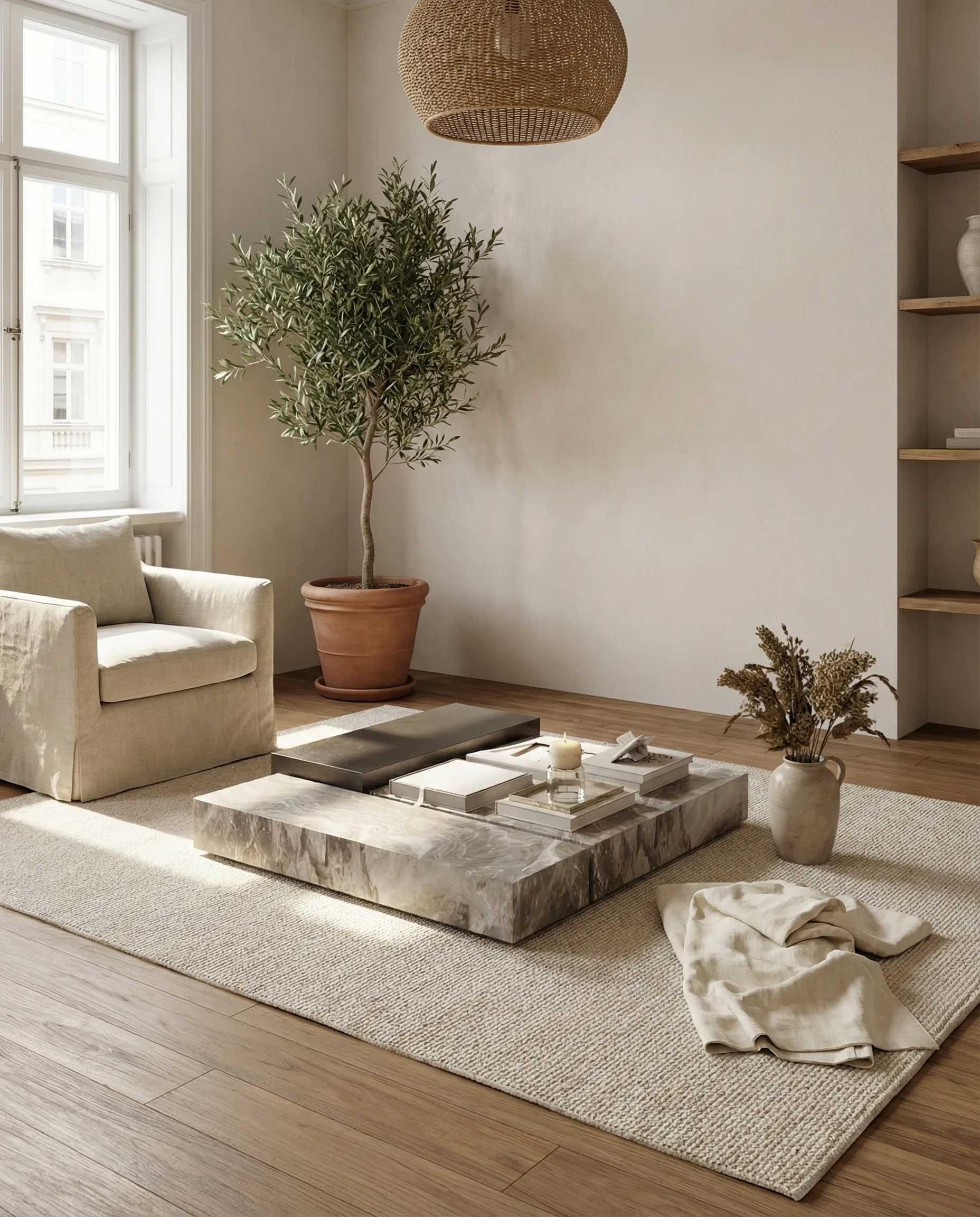 Territorio holds a room together. The coffee table is the one piece of furniture that every seat faces — it becomes the ground beneath conversation, beneath objects, beneath light. In stone, it holds that gravity permanently and without effort.