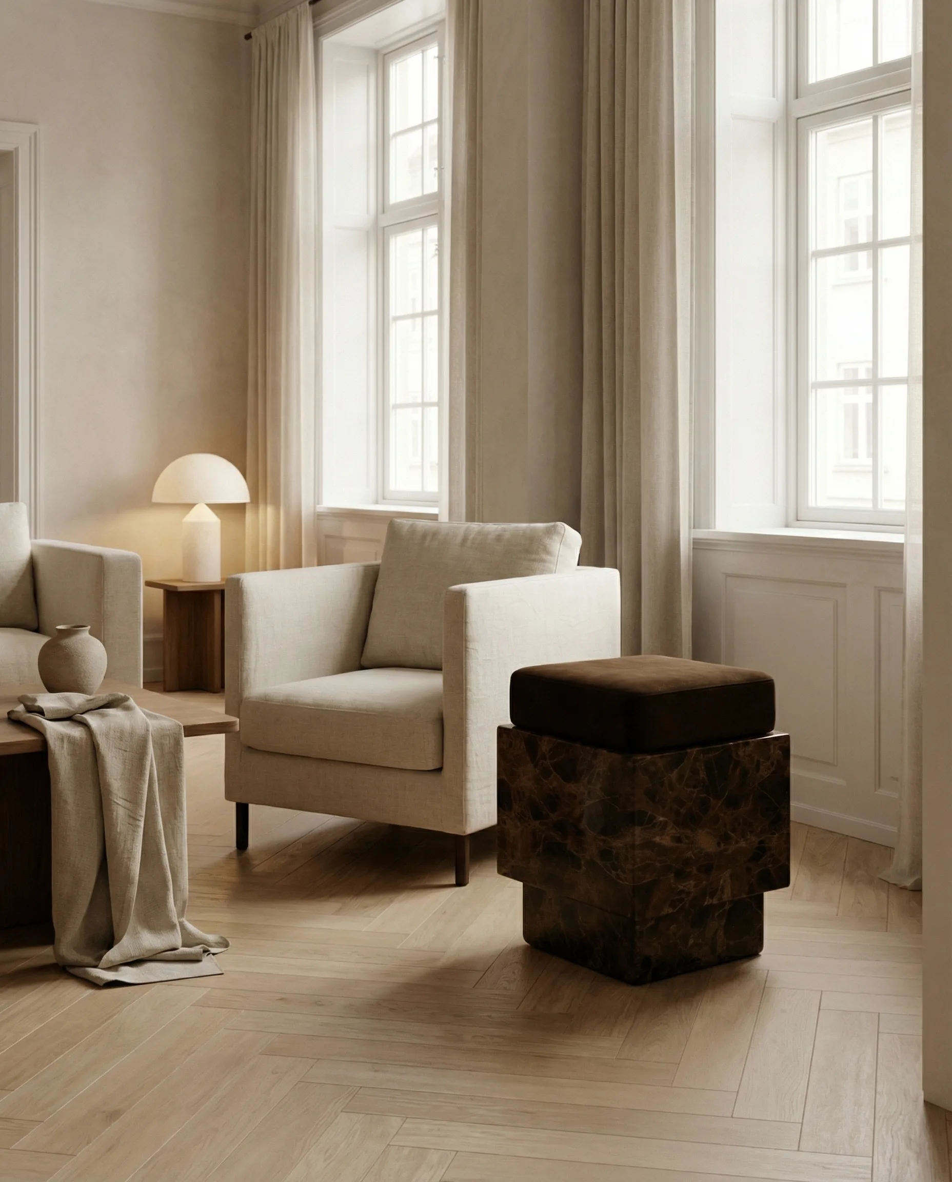 A marble stepped pedestal crowned with a dark velvet cushion — the stool as ceremonial object. Trono takes the idea of the throne and removes its excess, leaving only the essential act of elevation.